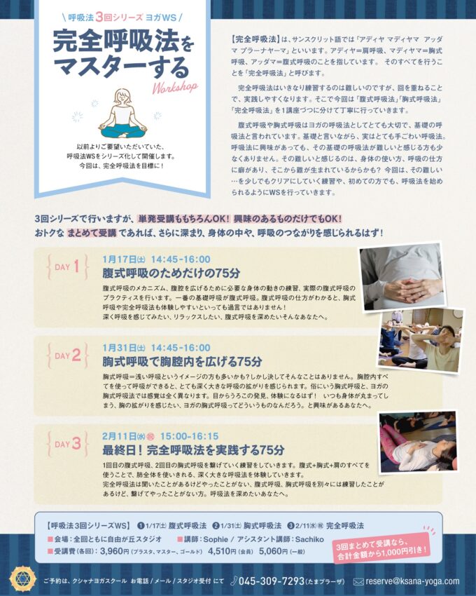 【呼吸法3回シリーズ、完全呼吸法をマスターするヨガWS】