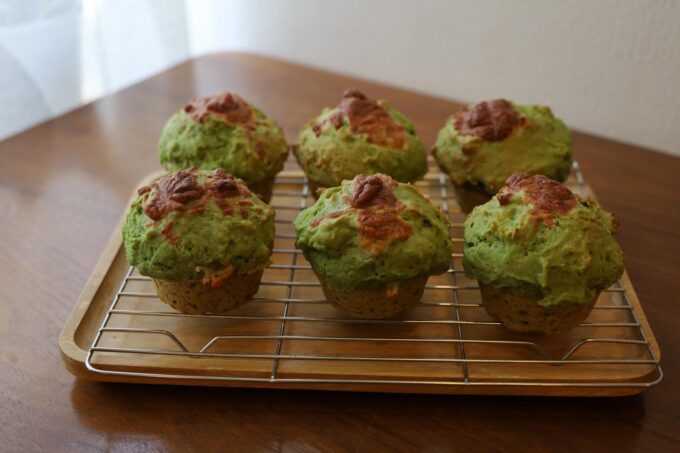生地に小松菜のピューレを練り込み、中にブロッコリーとモッツァレラチーズを入れて焼き上げました。