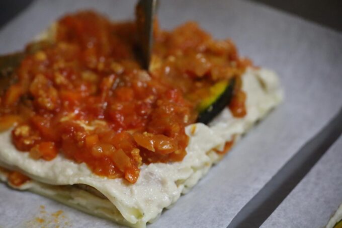 卵不使用のラザニア生地に、カシューナッツと玉ねぎ、豆乳で作ったベシャメルと、大豆ミートと野菜で作ったミートソース、季節の野菜を段々に重ね、モッツアレラチーズをのせて焼き上げます。(ヴィーガンの方はチーズ無しも可)