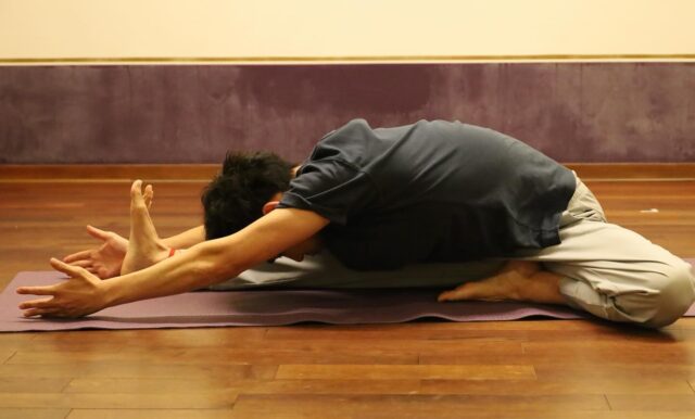 今回のメンズヨガでは、腰まわりを中心に、呼吸に合わせてゆっくりと動かしながら、”前屈”で深部から温めてほぐしていきます。