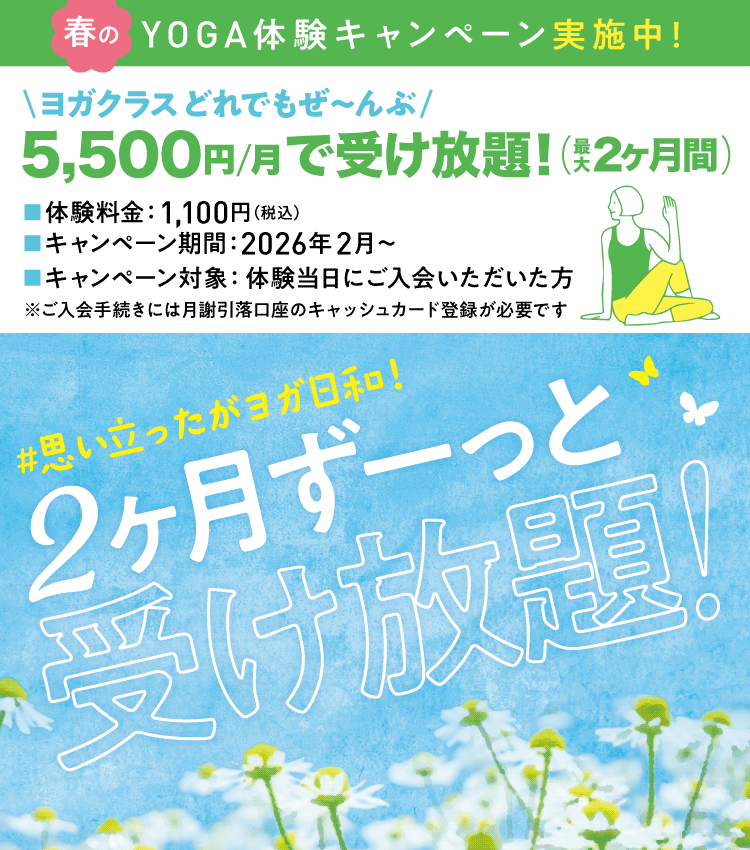 今なら、ヨガ屋クシャナのどのクラスも2ヶ月ずーっと受け放題!特別な2ヶ月をあなたにプレゼント!